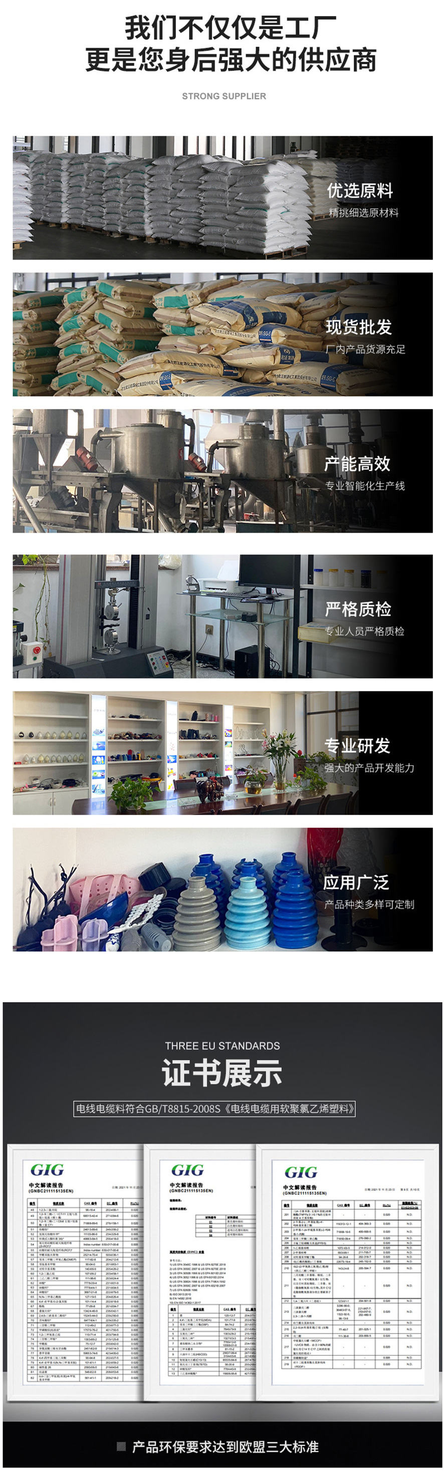 臺州市勇平塑業(yè)有限公司最早創(chuàng)建于1995年,專業(yè)生產(chǎn)PVC粒子料二十余年,公司座落于浙江省臺州市路橋區(qū)珠光工業(yè)園區(qū),2014將總部設于臺州市椒江區(qū)濱海工業(yè)園區(qū)聚明路258號。經(jīng)過二十多年從家庭工廠開始的勵精圖治和穩(wěn)步發(fā)展,現(xiàn)已成為PVC粒子的知名品牌,成功躋身行業(yè)前列。椒江總公司占地面積18余畝,成立產(chǎn)品研發(fā)中心,擁有現(xiàn)代化標準廠房。2015年通過全面技術改造,投入大量資金建設高端自動化生產(chǎn)線及檢測儀器,達到節(jié)能、高效、綠色環(huán)保。所有儀器設備的投入,是為了保證產(chǎn)品出廠合格率達到100%�,F(xiàn)公司年生產(chǎn)能力已達3-5萬多噸,成為中國PVC粒子重要的生產(chǎn)基地。公司產(chǎn)品有擠出、注塑、涂塑、透明、耐寒、無味、增韌、彈性等軟性及半硬性粒子料產(chǎn)品。企業(yè)通過SGS.PTS等認證,環(huán)保達到出口歐美ROHS、PAHS、REACH等要求。產(chǎn)品可用于:電線電纜料、插頭料、霓虹燈料、防硫化貼片料、箱包料、電器插頭、衛(wèi)浴墊片、汽摩配件、節(jié)日燈電線及配件、鞋材、門窗密封條、高壓氣管及各種日用品等。還為客戶量身定做各種要求聚氯乙烯粒子料。